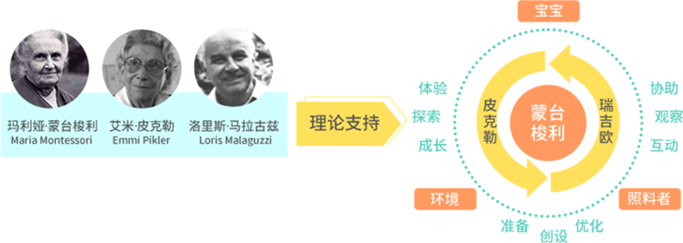 以蒙台梭利为核心,结合皮克勒、瑞吉欧理论,结合20年本土化实践经验,融合形成三大国际教育理念支持的‘Wonder Theory’理论,更适合中国家庭。